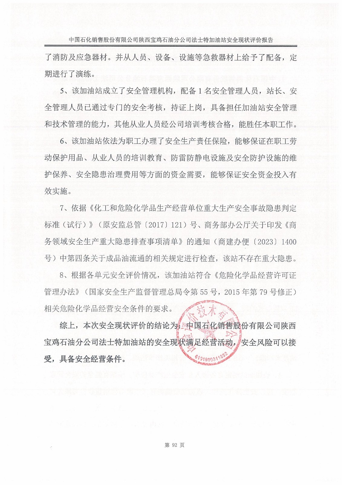 报告结论 | 本次安全现状评价的结论为:中国石化销售股份有限公司陕西宝鸡石油分公司法士特加油站的安全现状满足经营活动,安全风险可以接受,具备安全经营条件。 | ||||||