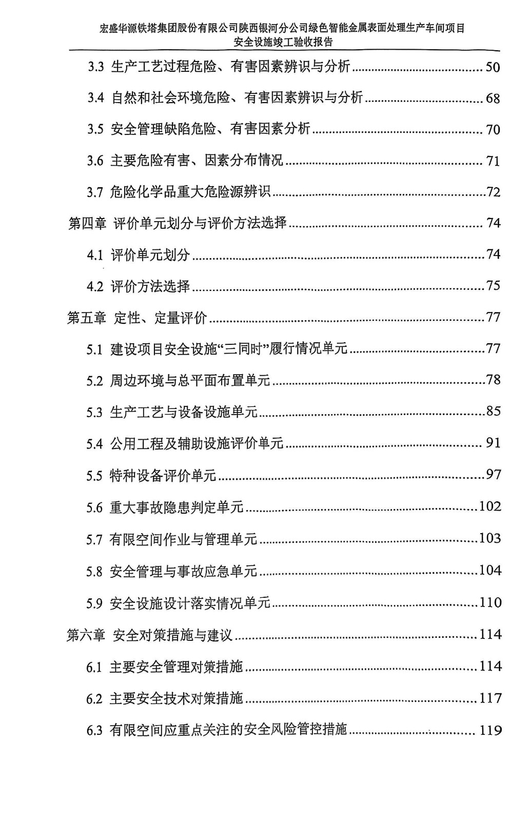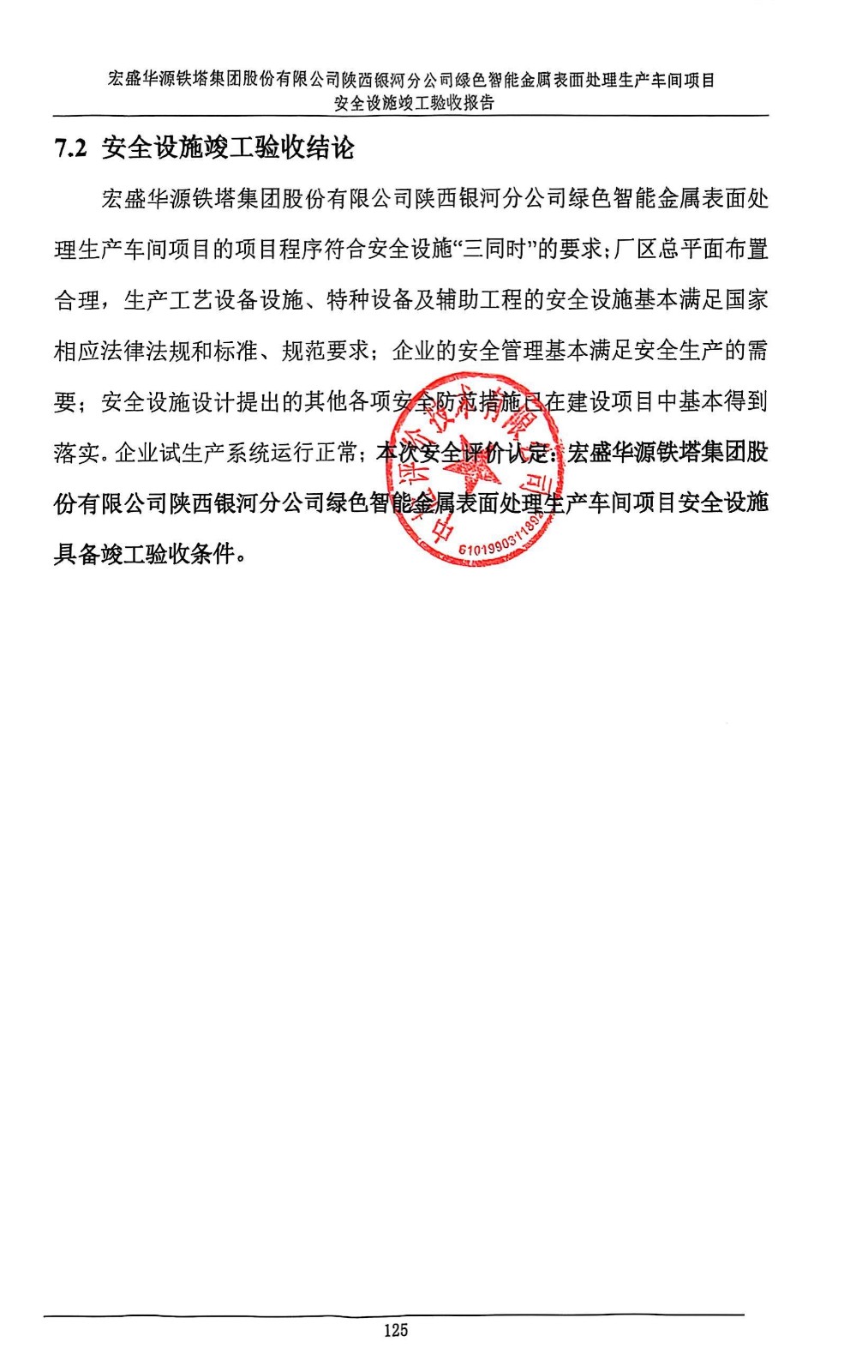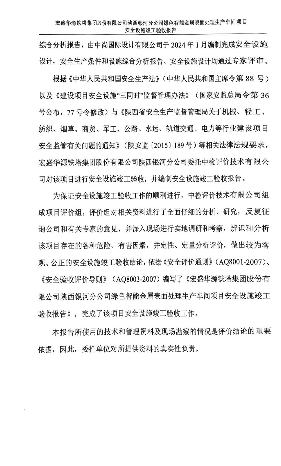 项目名称 | 宏盛华源铁塔集团股份有限公司陕西银河分公司 绿色智能金属表面处理生产车间项目安全设施竣工验收报告 | ||||||