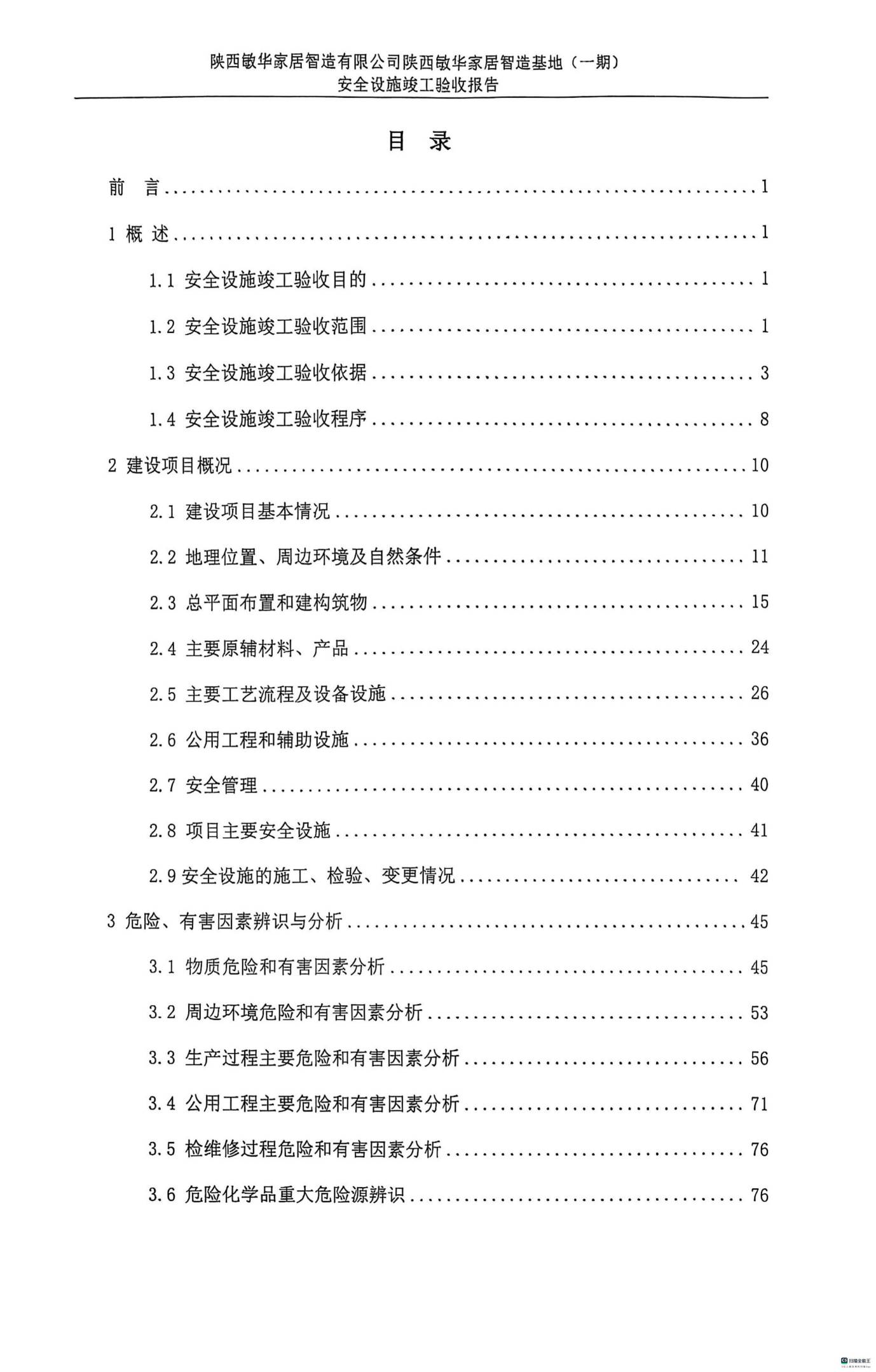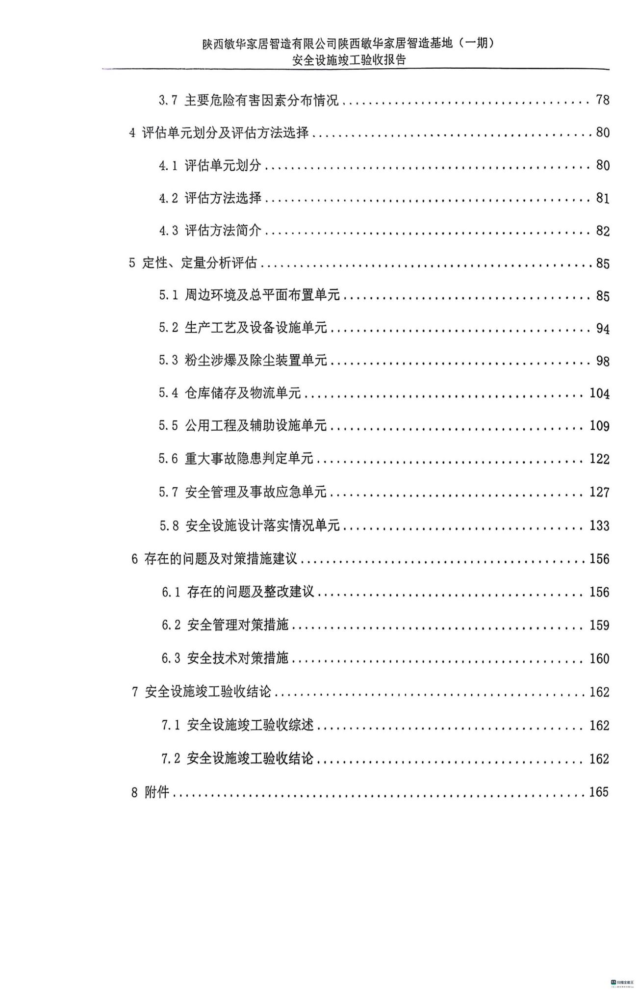 报告结论 | 陕西敏华家居智造有限公司陕西敏华家居智造基地(一期)项目的周边环境和总平面布置合理,生产工艺和设备设施、公用工程和辅助设施的安全设施设置较为充分,安全管理及事故应急符合现行法规的要求,项目试生产运行正常,具备安全设施竣工验收条件。 | ||||||