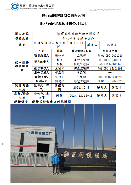 陕西闽锐玻璃制造有限公司职业病危害现状评价公开信息