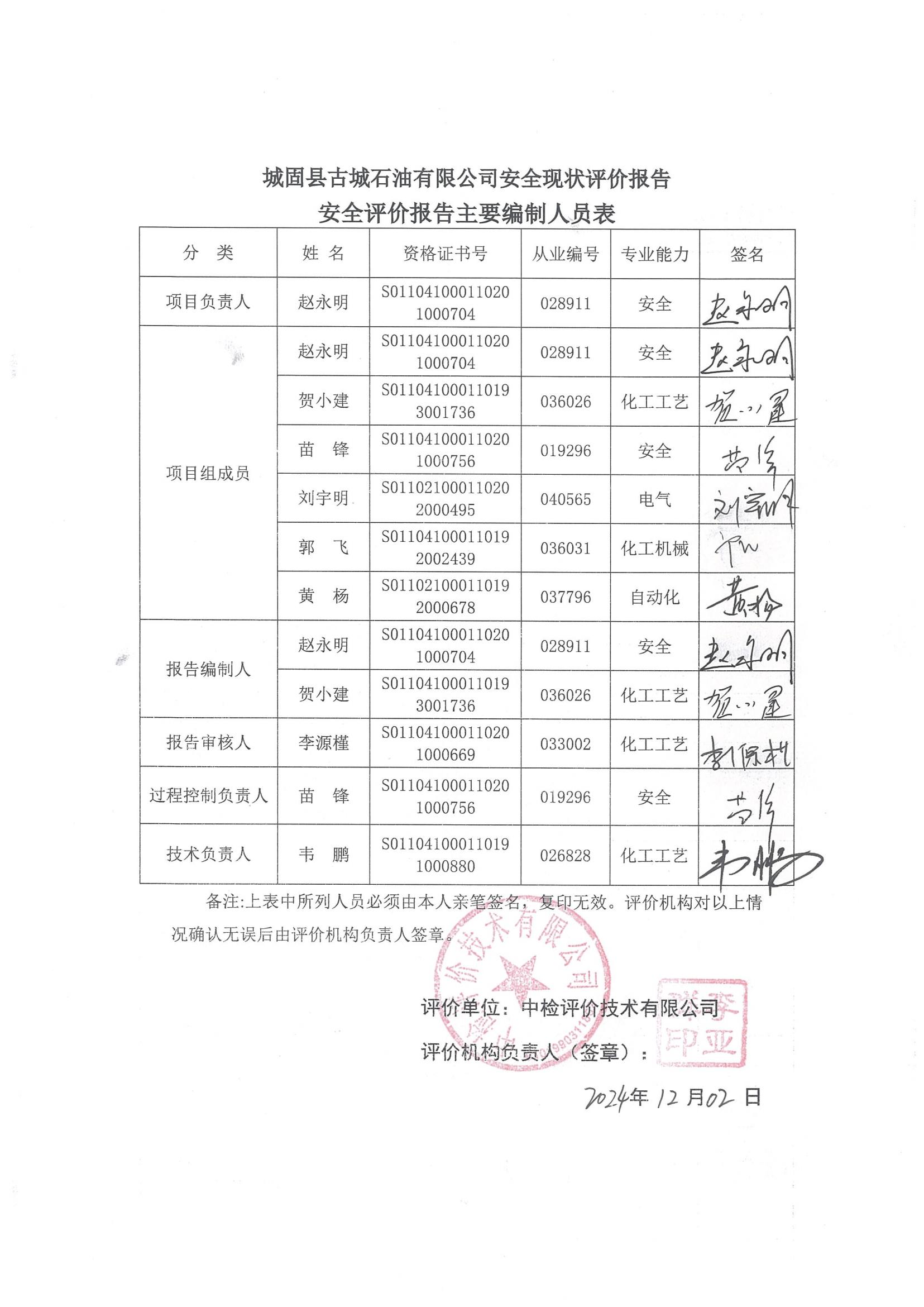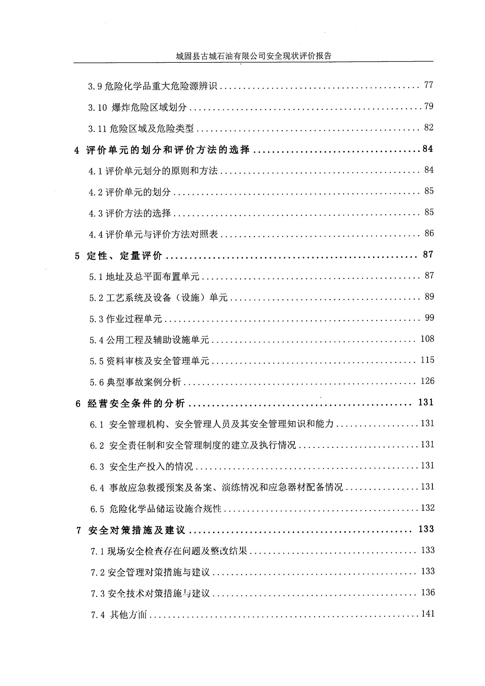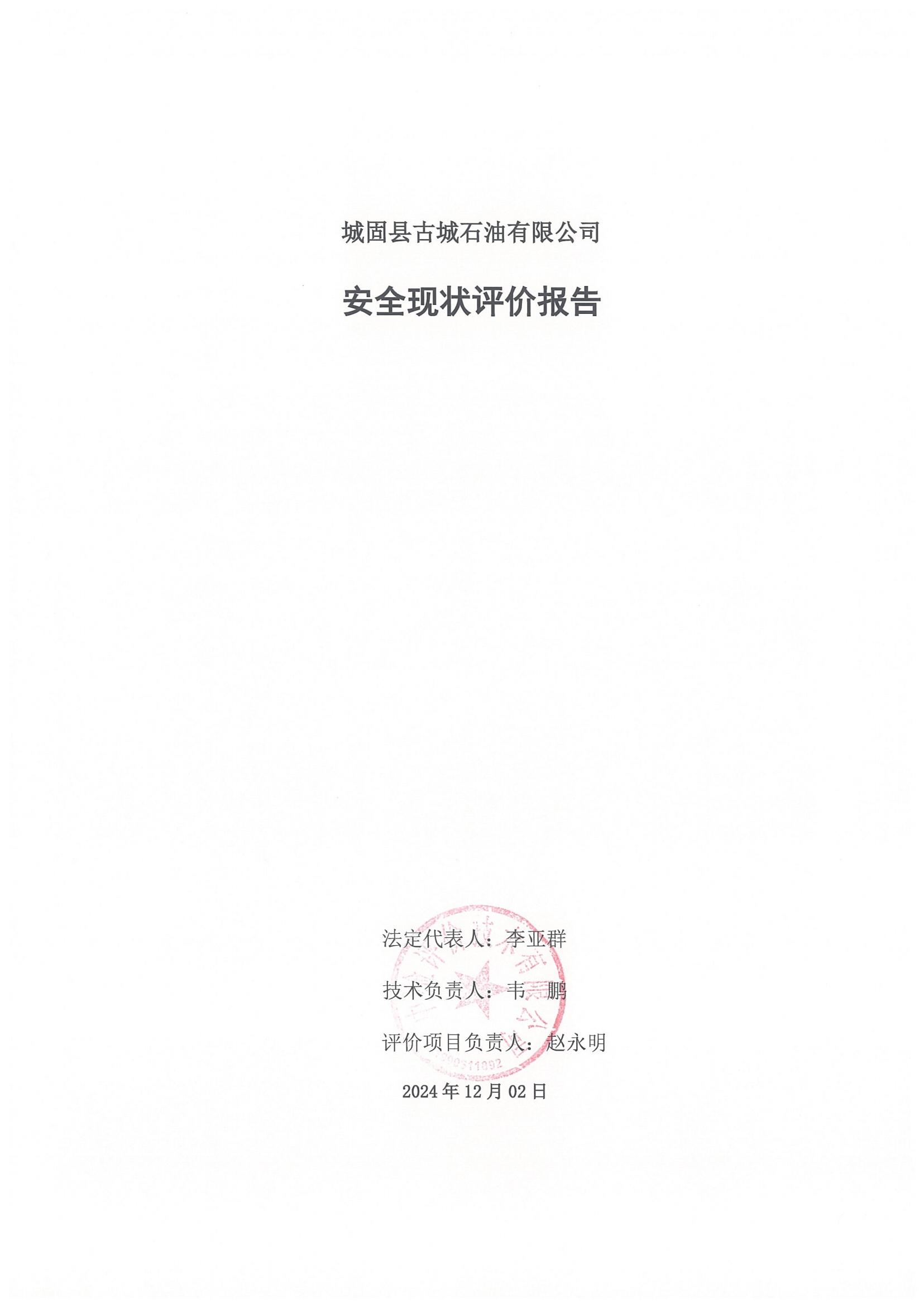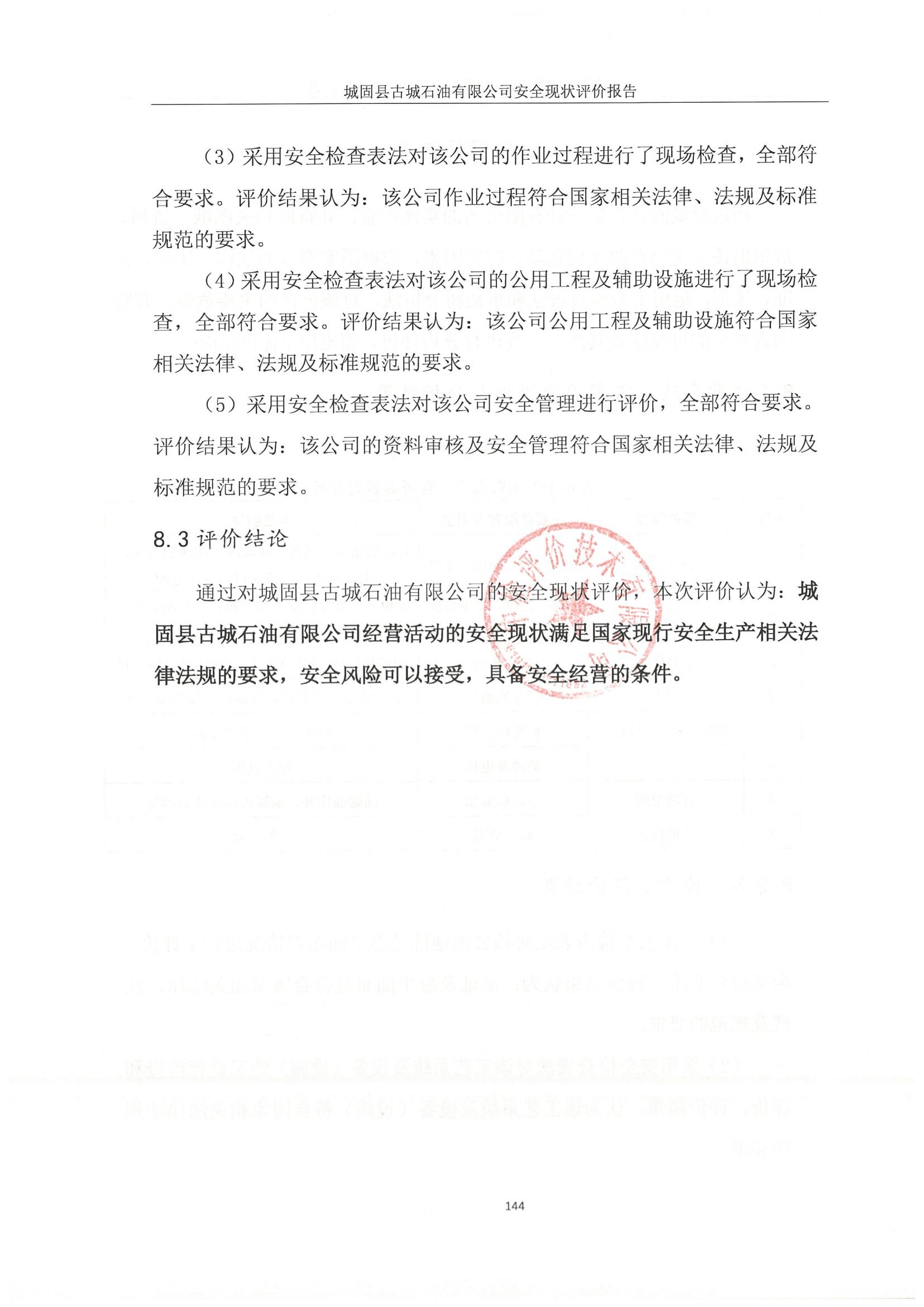 报告结论 | 评价结论:通过对城固县古城石油有限公司的安全现状评价,本次评价认为:城固县古城石油有限公司经营活动的安全现状满足国家现行安全生产相关法律法规的要求,安全风险可以接受,具备安全经营的条件。 | ||||||