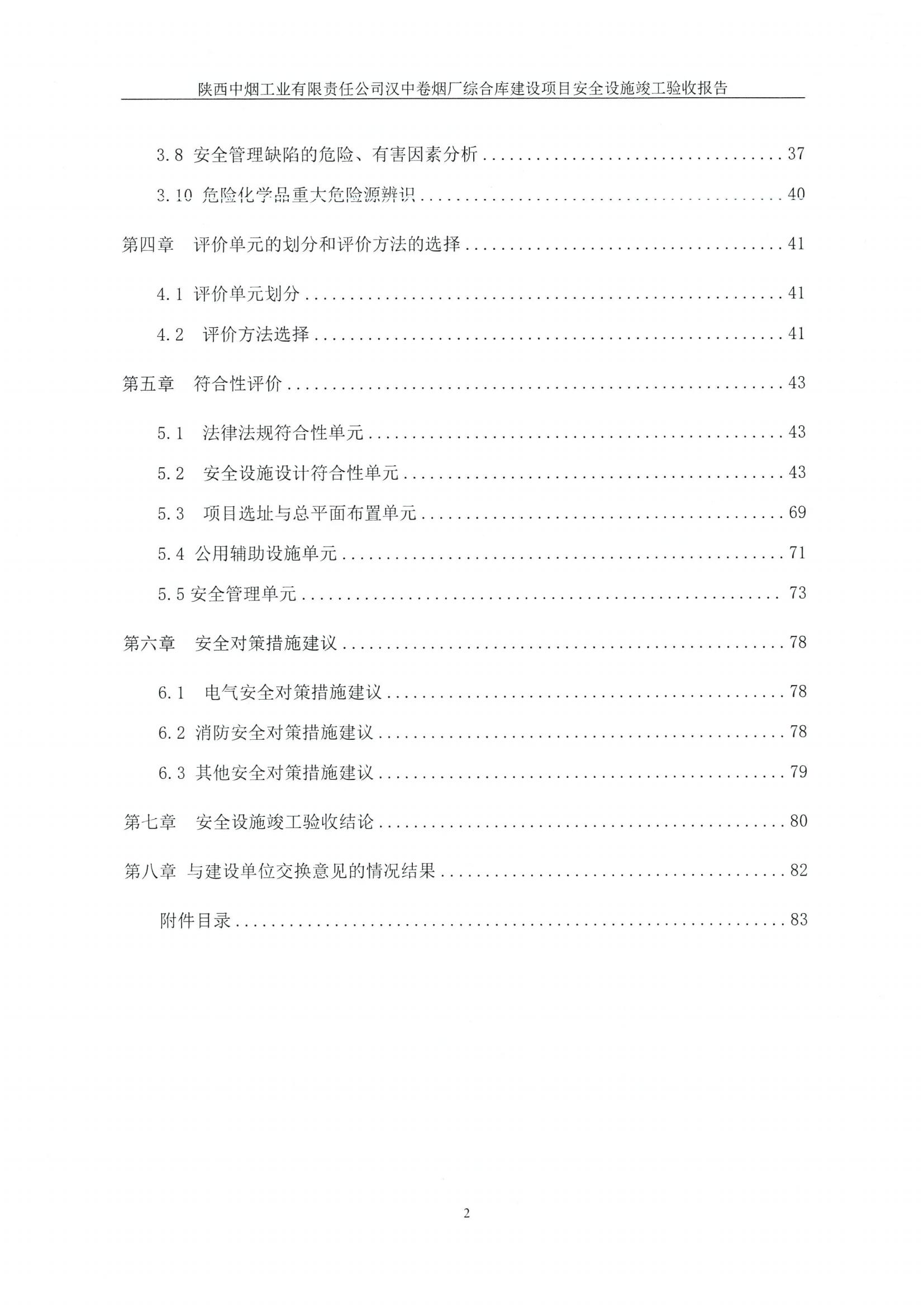 评价范围 | 本次安全设施竣工验收的范围为陕西中烟工业有限责任公司汉中卷烟厂综合库建设项目,包括该综合库建设项目外部安全条件、综合库建设项目平面布置、综合库建设项目配套设施、安全管理及应急管理的安全符合性评价。 本安全设施竣工验收报告所涉及的项目环保、职业卫生等方面的内容,以政府有关部门批准或认可的技术文件为准,不属于本次项目安全设施竣工验收范围之内。 | ||||||
