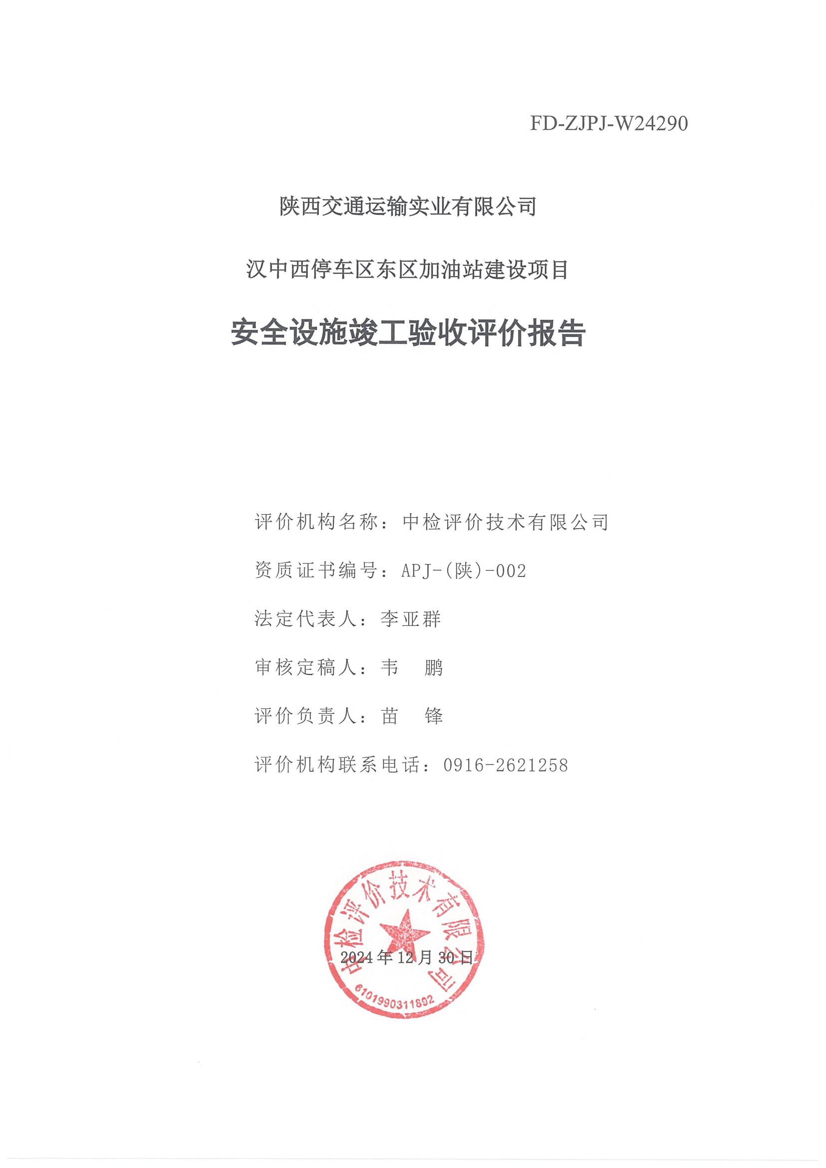 陕西交通运输实业有限公司汉中西停车区东区加油站安全设施竣工验收评价报告