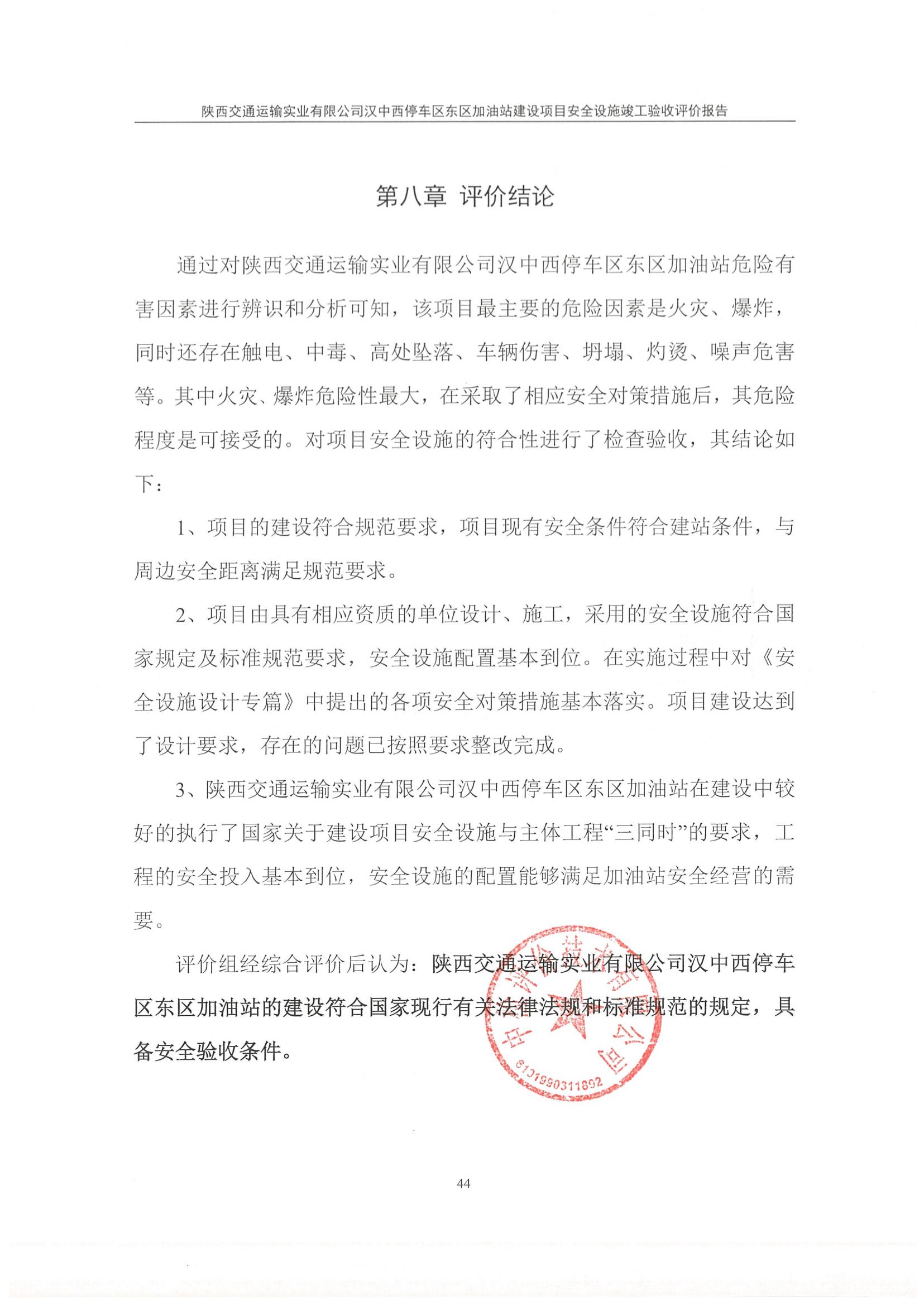 报告结论 | 陕西交通运输实业有限公司汉中西停车区东区加油站的建设符合国家现行有关法律法规和标准规范的规定,具备安全验收条件。 | ||||||