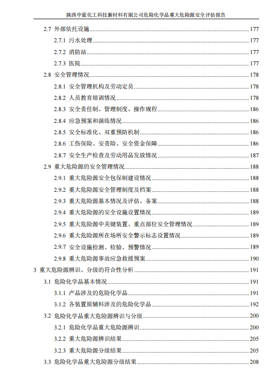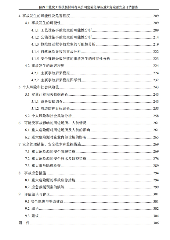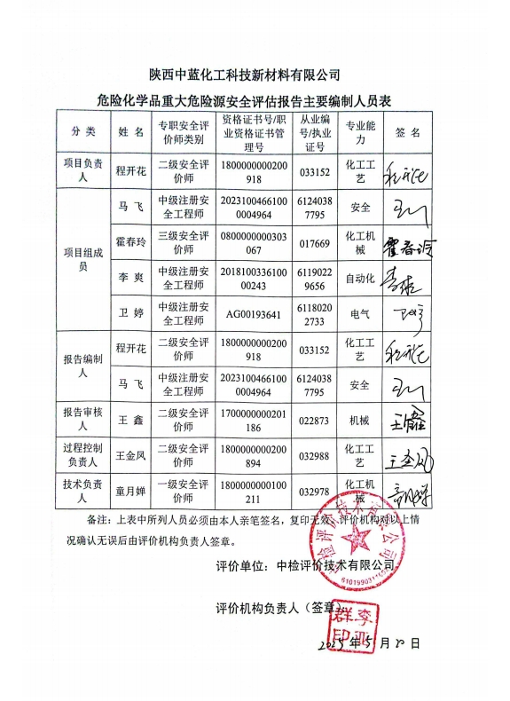 评价范围 | 本次评估的对象为陕西中蓝化工科技新材料有限公司,评估范围是:公司内构成重大危险源的危险化学品生产装置和储存设施及重大危险源的安全管理和事故应急管理。该公司非重大危险源的装置和储存设施,不在本次评估范围内。该公司所涉及的环境保护、职业卫生等评价业务不在本次安全评估范围内。 | ||||||
