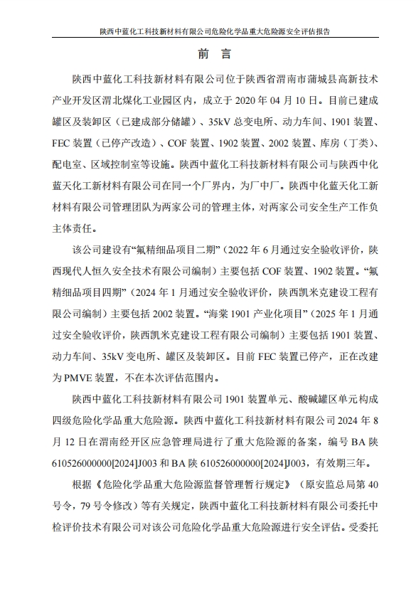 项目简介 | 陕西中蓝化工科技新材料有限公司位于陕西省渭南市蒲城县高新技术产业开发区渭北煤化工业园区内,成立于2020年04月10日。目前已建成罐区及装卸区(已建成部分储罐)、35kV总变电所、动力车间、1901装置、FEC装置(已停产改造)、COF装置、1902装置、2002装置、库房(丁类)、配电室、区域控制室等设施。陕西中蓝化工科技新材料有限公司与陕西中化蓝天化工新材料有限公司在同一个厂界内,为厂中厂。陕西中化蓝天化工新材料有限公司管理团队为两家公司的管理主体,对两家公司安全生产工作负主体责任。 该公司建设有“氟精细品项目二期”(2022年6月通过安全验收评价,陕西现代人恒久安全技术有限公司编制)主要包括COF装置、1902装置。“氟精细品项目四期”(2024年1月通过安全验收评价,陕西凯米克建设工程有限公司编制)主要包括2002装置。“海棠1901产业化项目”(2025年1月通过安全验收评价,陕西凯米克建设工程有限公司编制)主要包括1901装置、动力车间、35kV变电所、罐区及装卸区。目前FEC装置已停产,正在改建为PMVE装置,不在本次评估范围内。 根据《危险化学品重大危险源监督管理暂行规定》(原安监总局第40号令,79号令修改)等有关规定,陕西中蓝化工科技新材料有限公司委托中检评价技术有限公司对该公司危险化学品重大危险源进行安全评估。受委托后,中检评价技术有限公司成立了评估组,评估组在收集相关技术资料及现场勘查的基础上,对该公司危险化学品生产装置和储存设施,进行了认真细致的辨识、评估、计算与分析,并对照相关标准、规范对该公司危险化学品重大危险源进行安全评估,针对已有的安全措施,补充提出了相应的安全建议,得出了明确、合理的重大危险源安全评估结论,并编制了《陕西中蓝化工科技新材料有限公司危险化学品重大危险源安全评估报告》。 | ||||||
