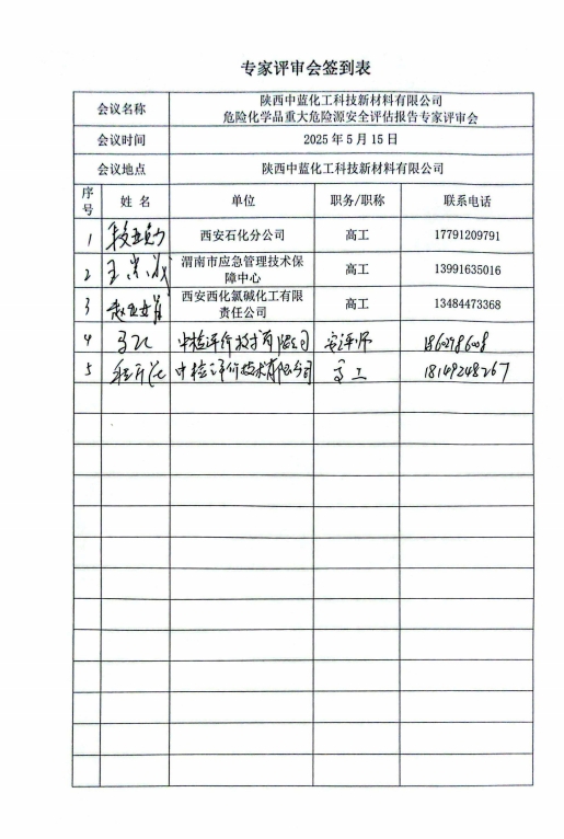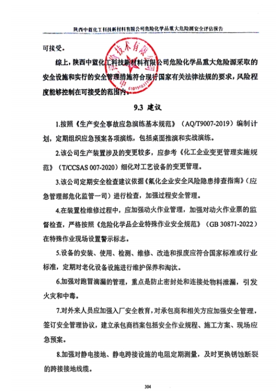 报告结论 | 陕西中蓝化工科技新材料有限公司危险化学品重大危险源采取的安全设施和实行的安全管理措施符合现行国家有关法律法规的要求,风险程度能够控制在可接受的范围内。 | ||||||