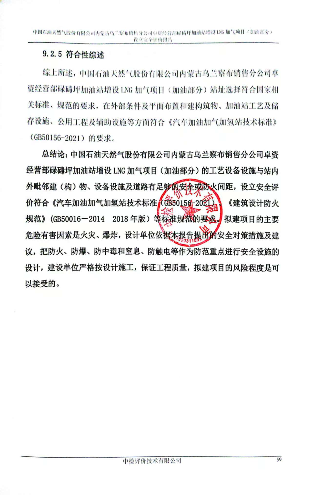 报告结论 | 中国石油天然气股份有限公司内蒙古乌兰察布销售分公司卓资 经营部碌碡坪加油站增设 LNG 加气项目(加油部分)的工艺设备设施与站内 外毗邻建(构)物、设备设施及道路有足够的安全或防火间距,设立安全评 价符合《汽车加油加气加氢站技术标准(GB50156-2021)、《建筑设计防火 规范》 (GB50016-2014 2018 年版)等标准规范的要求。拟建项目的主要 危险有害因素是火灾、爆炸,设计单位依据本报告提出的安全对策措施及建 议,把防火、防爆、防中毒和窒息、防触电等作为防范重点进行安全设施的 设计,建设单位严格按设计施工,保证工程质量,拟建项目的风险程度是可以接受的。 | ||||||
