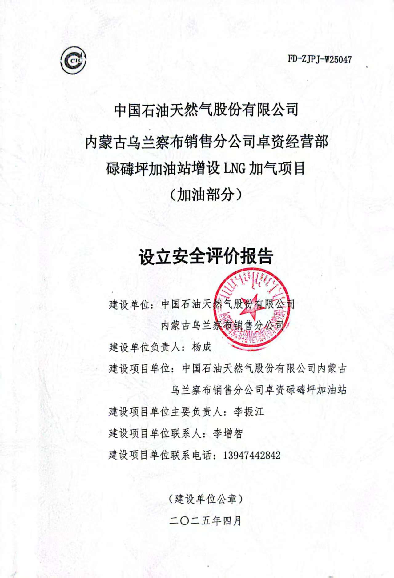 中国石油天然气股份有限公司内蒙古乌兰察布销售分公司卓资经营部碌碡坪加油站增设 LNG 加气项目(加油部分)设立安全评价报告