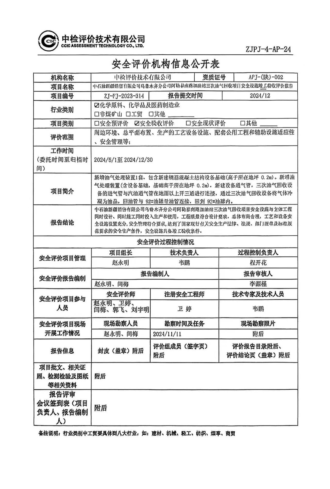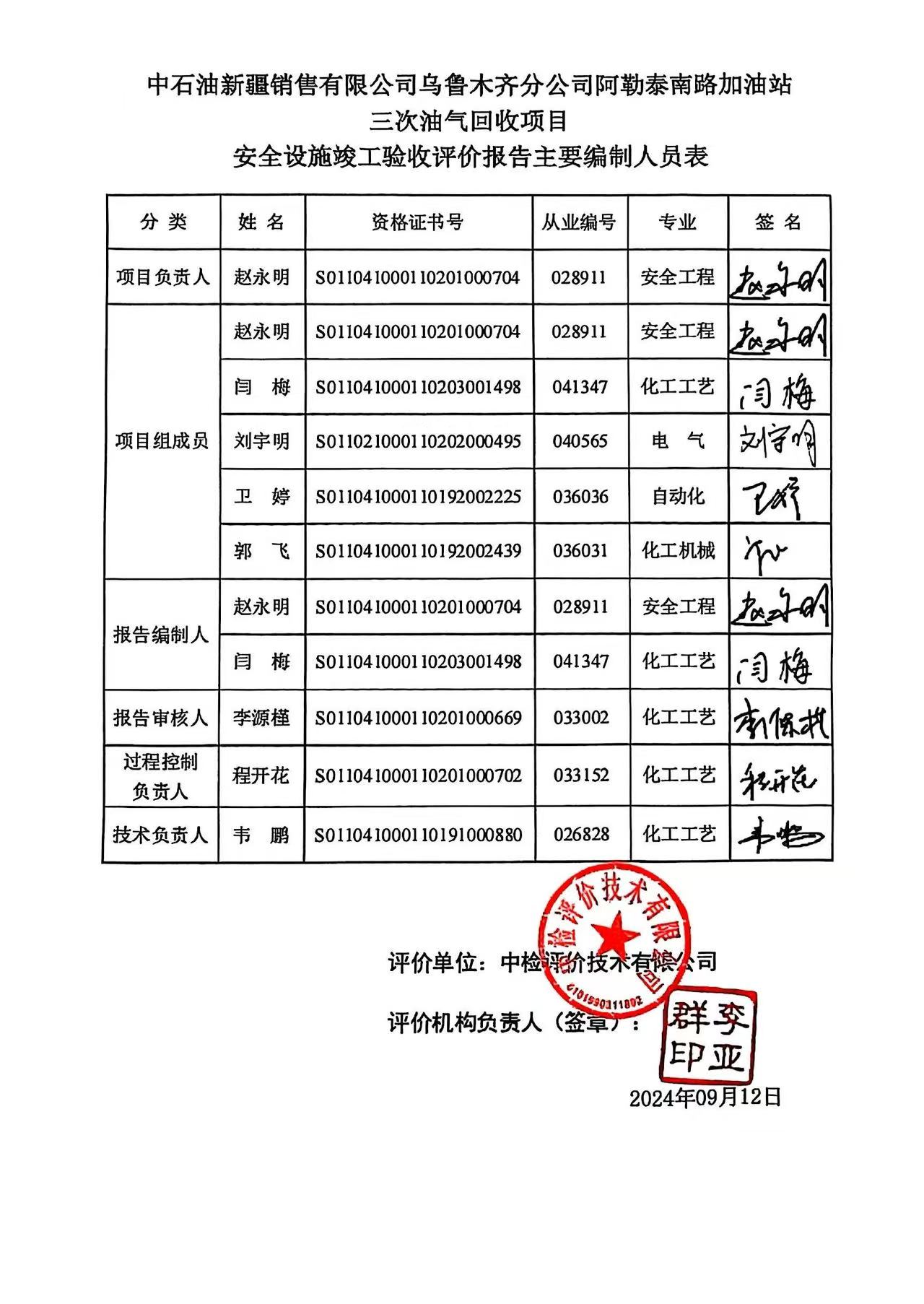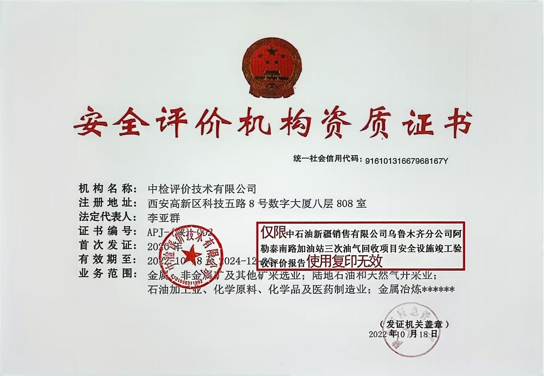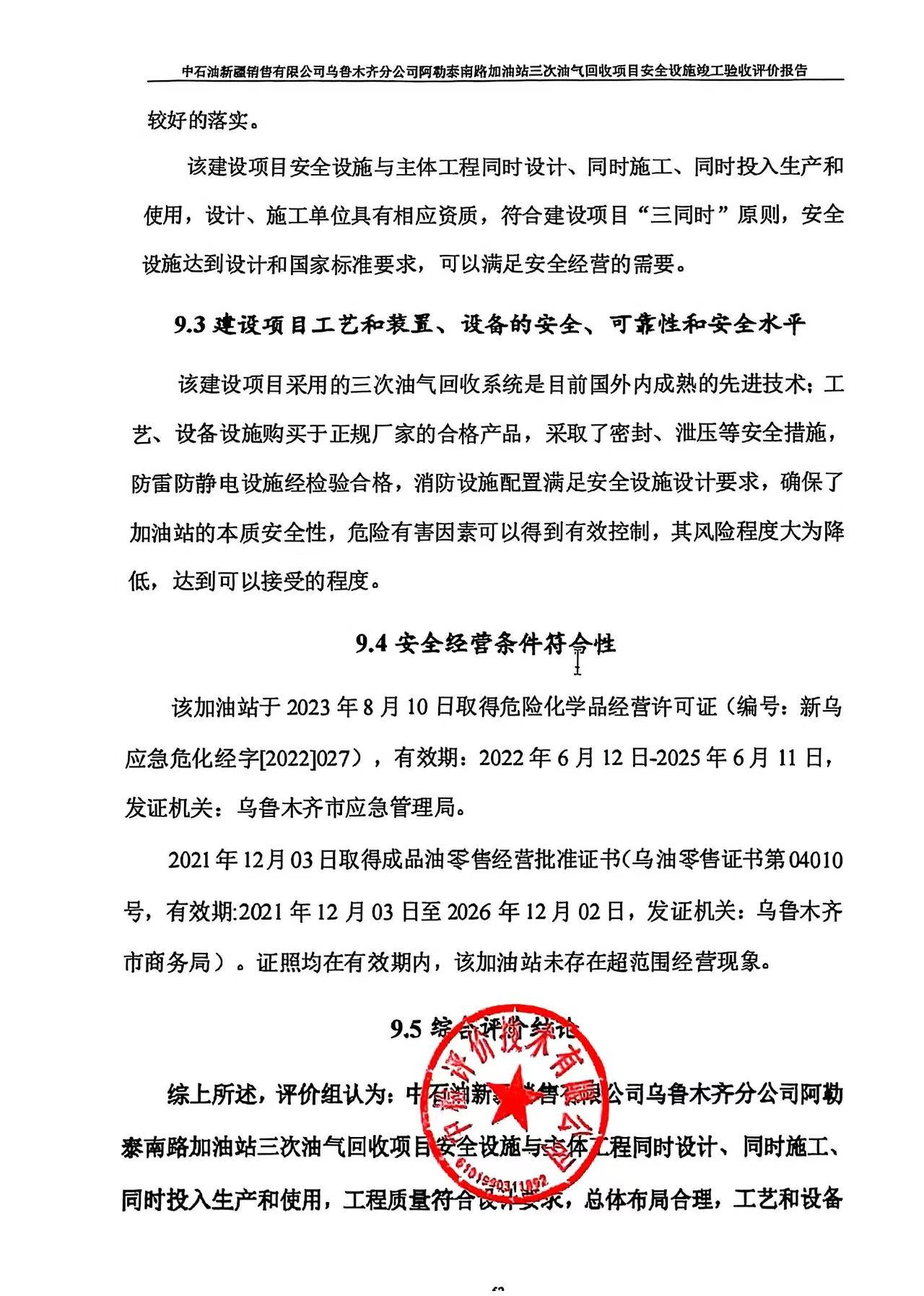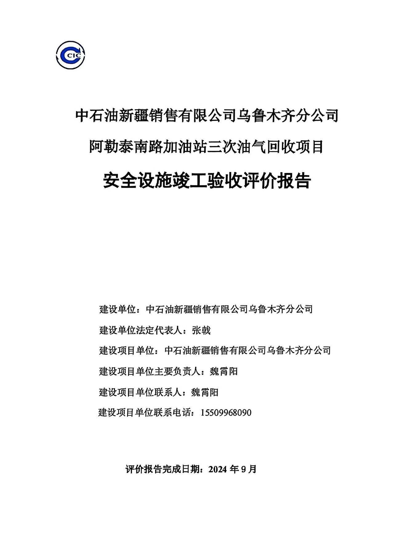 中石油新疆销售有限公司乌鲁木齐分公司阿勒泰南路加油站三次油气回收项目安全设施竣工验收评价报告