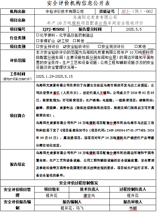 乌海阳光炭素有限公司年产10万吨煅料项目配套分筛车间安全验收评价报告