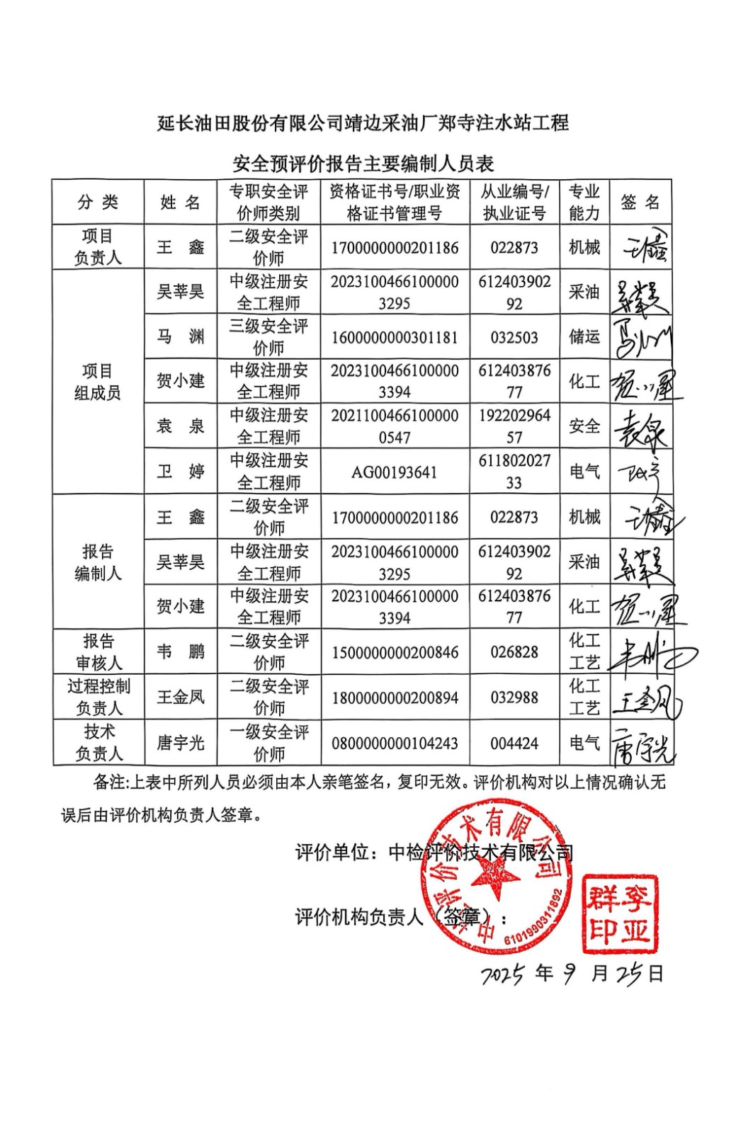 安全评价项目管理 | 项目组长 | 技术负责人 | 过程控制负责人 | ||||