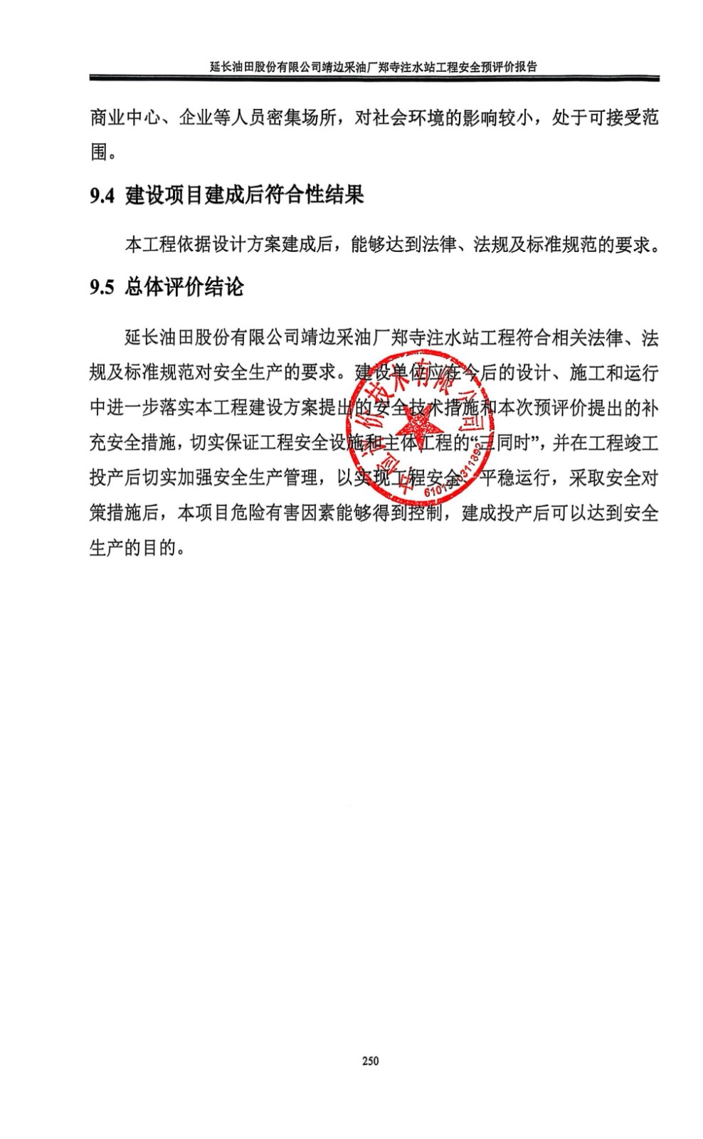 报告结论 | 延长油田股份有限公司靖边采油厂郑寺注水站工程符合相关法律、法规及标准规范对安全生产的要求。建设单位应在今后的设计、施工和运行中进一步落实本工程建设方案提出的安全技术措施和本次预评价提出的补充安全措施,切实保证工程安全设施和主体工程的“三同时”,并在工程竣工投产后切实加强安全生产管理,以实现工程安全、平稳运行,采取安全对策措施后,本项目危险有害因素能够得到控制,建成投产后可以达到安全生产的目的。 | ||||||