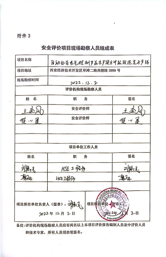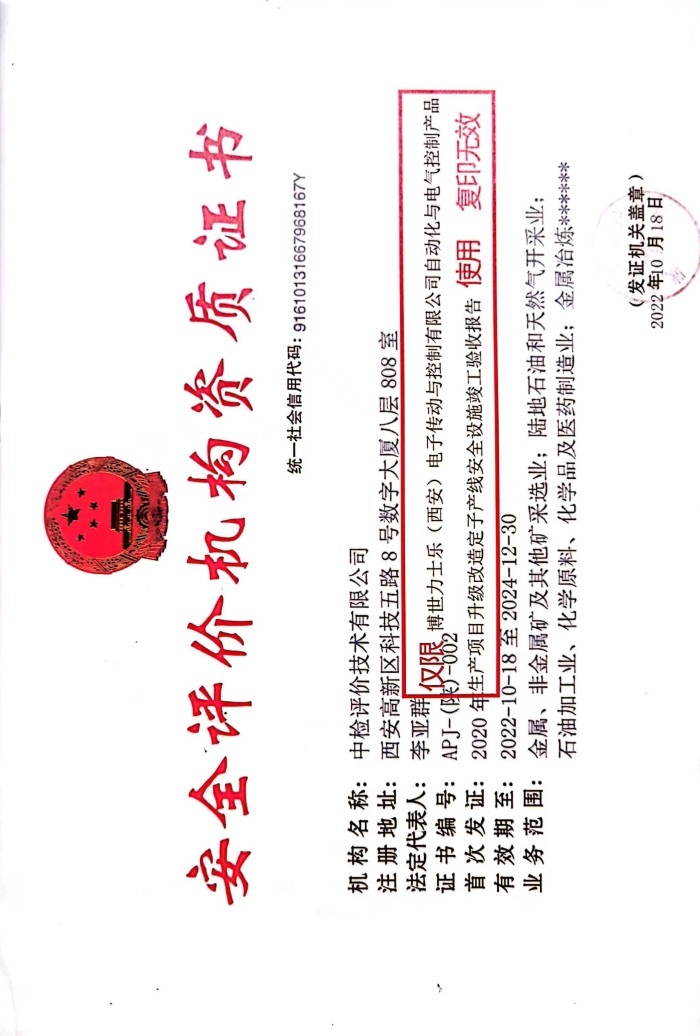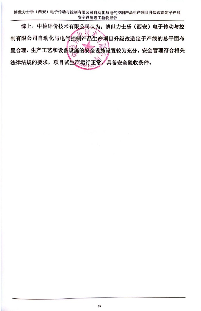报告结论 | 博世力士乐(西安)电子传动与控制有限公司自动化与电气控制产品生产项目升级改造定子产线的总平面布置合理,生产工艺和设备设施的安全设施设置较为充分,安全管理符合相关法律法规的要求,项目试生产运行正常,具备安全验收条件。 | ||||||